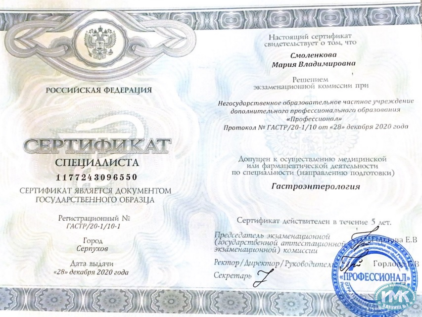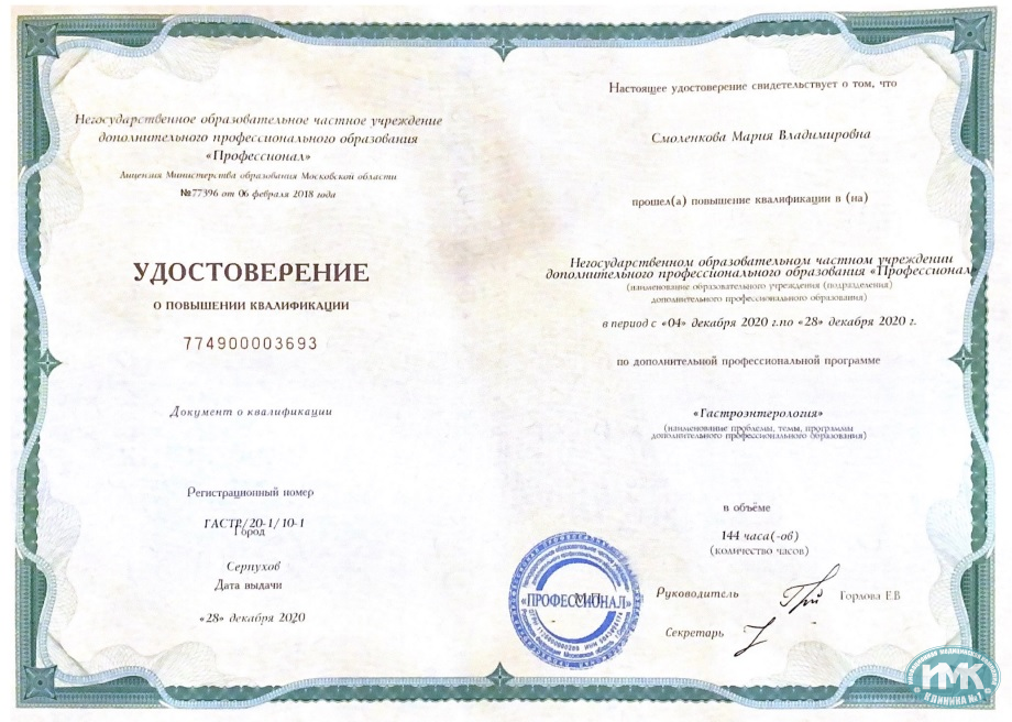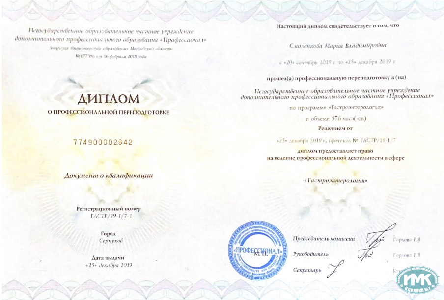 Мария Владимировна прошла профессиональную переподготовку по программе "Гастроэнтерология".