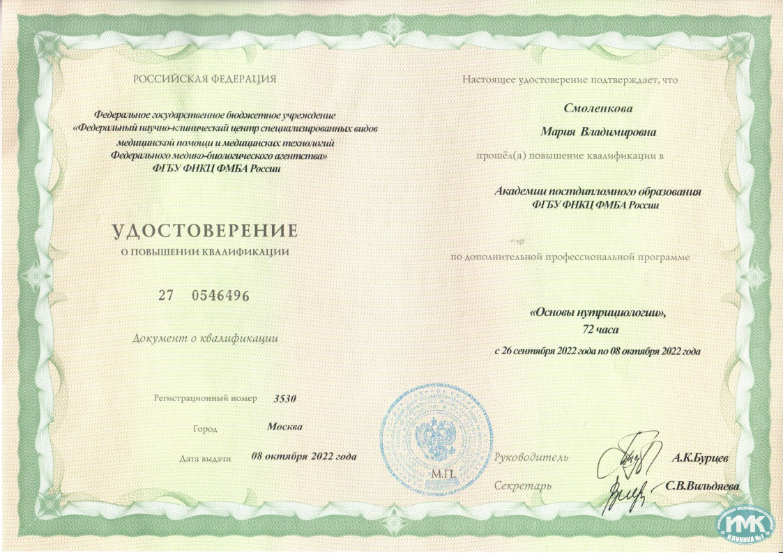 Прошла повышение квалификации в Российской академии последипломного образования по программе «Терапия».